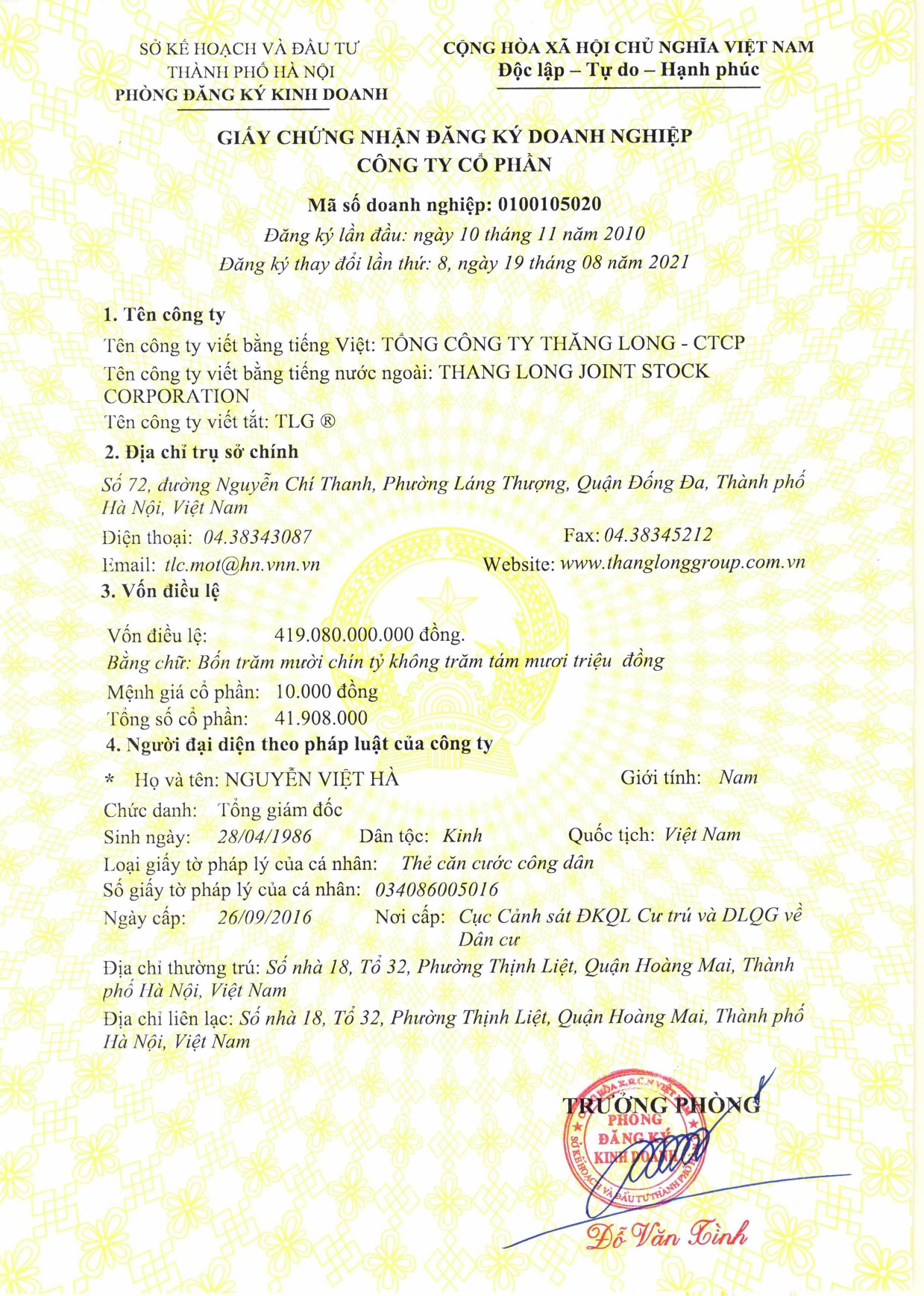 Công bố thay đổi Giấy chứng nhận đăng ký doanh nghiệp Ngày đăng : 14:51:37 26-08-2021Ngày 26/8/2021 Tổng công ty Thăng Long-CTCP đã được Sở kế hoạch đầu tư TP Hà Nội cấp Giấy chứng nhận đăng ký doanh nghiệp thay đổi lần thứ 8. Tags:,Bình luận bằng tài khoản facebook Bình luận bằng tài khoản Google Tin cùng danh mụcBáo cáo thường niên năm 2025 Công bố thông tin Báo cáo tài chính năm 2025 Công bố thông tin Quyết định xử phạt vi phạm hành chính thuế Công bố thông tin Quyết định bổ nhiệm Phó Tổng giám đốc CBTT Nghị quyết Hội đồng quản trị v/v" Thông qua việc triệu tập và tổ chức họp ĐHĐCĐ thường niên năm 2026 của Tổng công ty Thăng Long -CTCP" Quyết định bổ nhiệm Giám đốc Tài chính Tổng công ty Báo cáo tình hình quản trị công ty năm 2025 Báo cáo tài chính Quý 4/2025 Nghị quyết HĐQT v/v " Phê duyệt hạn mức tín dụng tại Ngân hàng TMCP Đầu tư & Phát triển Việt Nam - Chi nhánh Nam Hà Nội" Nghị quyết HĐQT về việc thông qua chủ trương thực hiện các Hợp đồng/Giao dịch giữa công ty với người có liên quan năm 2026 Công bố thông tin Nghị quyết Hội đồng quản trị Thông qua chủ trương mua lại vốn góp tại Công ty TNHH BOT Cần Thơ - Phụng Hiệp Công bố thông tin Thông báo tỷ lệ sở hữu nước ngoài tối đa của Công ty Công bố thông tin Điều lệ Tổng công ty Thăng Long - CTCP Công bố thông tin Nghị quyết Hội đồng Quản trị Công bố thông tin thay đổi nội dung đăng ký doanh nghiệp Công bố thông tin thay đổi Giấy chứng nhận đăng ký doanh nghiệp CBTT Nghị quyết Hội đồng quản trị CBTT Biên bản họp và Nghị quyết Đại hội đồng cổ đông bất thường năm 2025 Thông báo mời họp và tài liệu Đại hội đồng cổ đông bất thường năm 2025 Công bố thông tin Nghị Quyết Hội Đồng Quản trị Báo cáo tài chính quý 3 năm 2025 Quyết định bổ nhiệm ông Chu Việt Hà giữ chức vụ Phó Tổng giám đốc CBTT Nghị quyết HĐQT Thông qua chủ trương thành lập các công ty con CBTT Nghị quyết HĐQT " Thông qua việc hủy ngày đăng ký cuối cùng lấy ý kiến cổ đông bằng văn bản và tổ chức cuộc họp ĐHĐCĐ bất thường" Nghị quyết Hội đồng quản trị Thông qua chủ trương thành lập Công ty TNHH Bất động sản công nghiệp Thăng Long" Thông báo thực hiện quyền đề cử , ứng cử thành viên HĐQT của cổ đông và kế hoạch lấy ý kiến cổ đông bằng văn bản năm 2025 CBTT Nghị quyết của Hội đồng quản trị CBTT Thông báo thay đổi giấy chứng nhận đăng ký doanh nghiệp Báo cáo tài chính giữa niên độ năm 2025 CBTT Thông báo thay đổi giấy chứng nhận đăng ký hoạt động chi nhánh Công bố thông tin nghị quyết Hội đồng quản trị Báo cáo tài chính quý 2 năm 2025 CBTT Thay đổi giấy chứng nhận đăng ký doanh nghiệp Báo cáo tình hình quản trị bán niên năm 2025 CBTT Ký kết hợp đồng kiểm toán với Công ty TNHH Kiểm toán CPA VIETNAM Cập nhật địa chỉ trụ sở chính của Tổng công ty Công bố thông tin Nghị quyết Hội đồng quản trị v/v " Phát hành chính thức Điều lệ Tổng công ty Thăng Long -CTCP" Tổng Công ty Thăng Long -CTCP tổ chức thành công Đại hội đồng cổ đông thường niên năm 2025 CBTT Biên bản họp và Nghị quyết Đại hội đồng cổ đông thường niên năm 2025 Nghị quyết thông qua thay đổi Phương án trả thù lao cho Hội đồng quản trị, Ban kiểm soát năm 2025 để bổ sung tài liệu họp ĐHĐCD thường niên năm 2025 của Tổng công ty Thông báo ứng viên bầu bổ sung thành viên HĐQT độc lập của Tổng công ty Thăng Long-CTCP Báo cáo tài chính Quý 1 năm 2025 CBTT : Nghị quyết thông qua bổ sung chương trình họp và tài liệu ĐHĐCĐ thường niên năm 2025 của Tổng công ty Thông báo Danh sách ứng viên thành viên bầu bổ sung Hội đồng quản trị, ban kiểm soát của Tổng công ty nhiệm kỳ 2024-2029 CBTT - Nhận được đơn đề nghị xin thôi giữ chức vụ thành viên HĐQT của ông Nguyễn Việt Cường Thông báo mời họp và Tài liệu Đại hội đồng cổ đông thường niên năm 2025 CBTT Nghị quyết HĐQT v/v Phê duyệt hạn mức tín dụng tại các ngân hàng năm 2025-2026 CBTT Nghị quyết HĐQT về việc gia hạn thời gian tổ chức Đại hội đồng cổ đông thường niên năm 2025 Báo cáo thường niên năm 2024 Báo cáo tài chính hợp nhất/riêng năm 2024 Thông báo về ngày đăng ký cuối cùng và xác nhận danh sách người sở hữu chứng khoán Nghị quyết Kế hoạch tổ chức Đại hội đồng cổ đông thường niên năm 2025 Công bố thông tin : Hủy thông báo ngày đăng ký cuối cùng để thực hiện quyền tham dự ĐHĐCĐ bất thường năm 2025 Công bố thông tin - Nghị Quyết HĐQT v/v Dừng tổ chức ĐHĐCĐ bất thường năm 2025 Thông báo về ngày đăng ký cuối cùng và xác nhận danh sách người sở hữu chứng khoán Nghị quyết HĐQT v/v Kế hoạch tổ chức Đại hội đồng cổ đông bất thường năm 2025 CBTT : Nhận được đơn thôi thành viên HĐQT và thành viên Ban Kiểm soát Tổng công ty Thông qua chủ trương thực hiện các giao dịch với Người có liên quan năm 2025 Báo cáo tài chính Quý 4 năm 2024 Báo cáo 