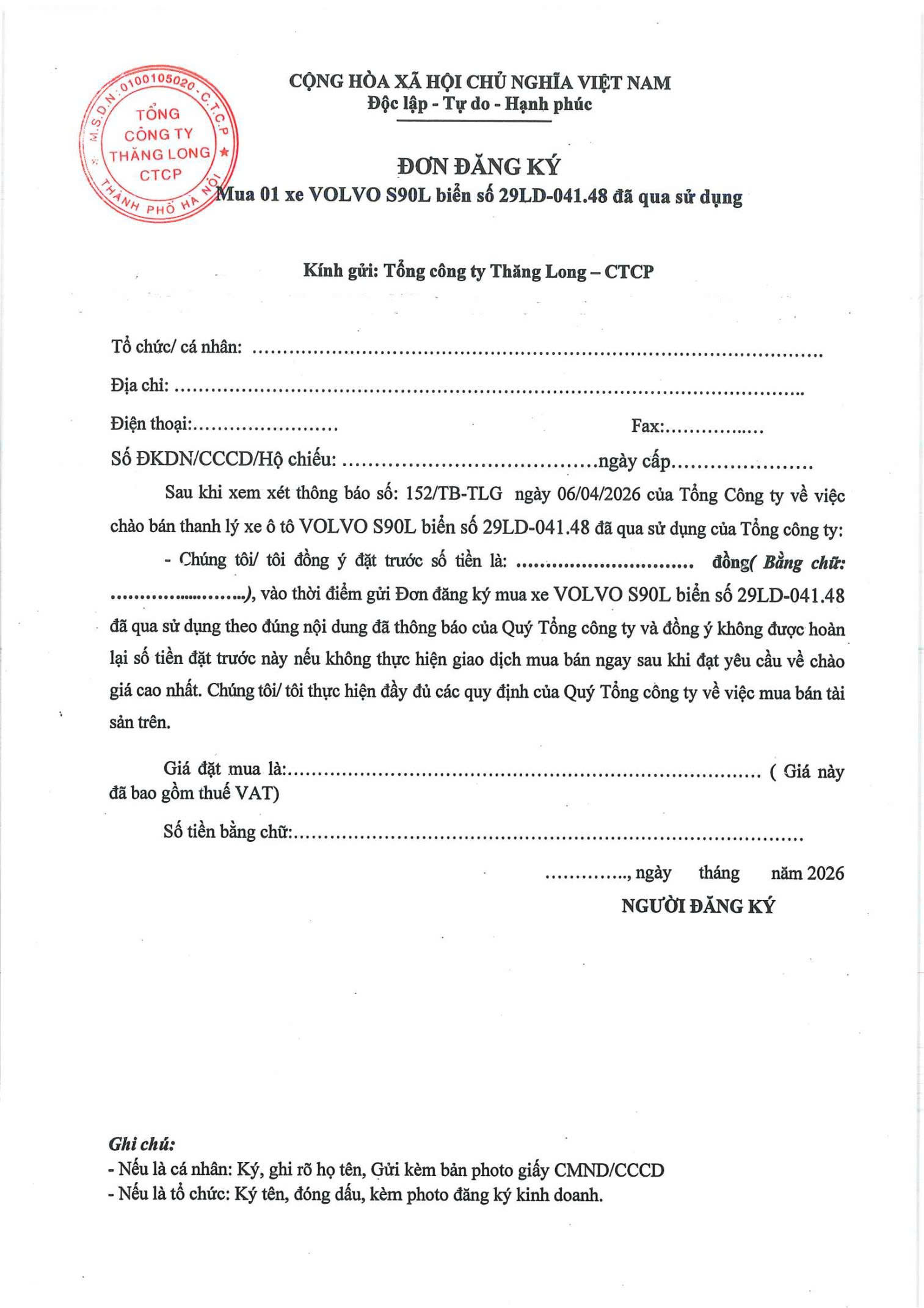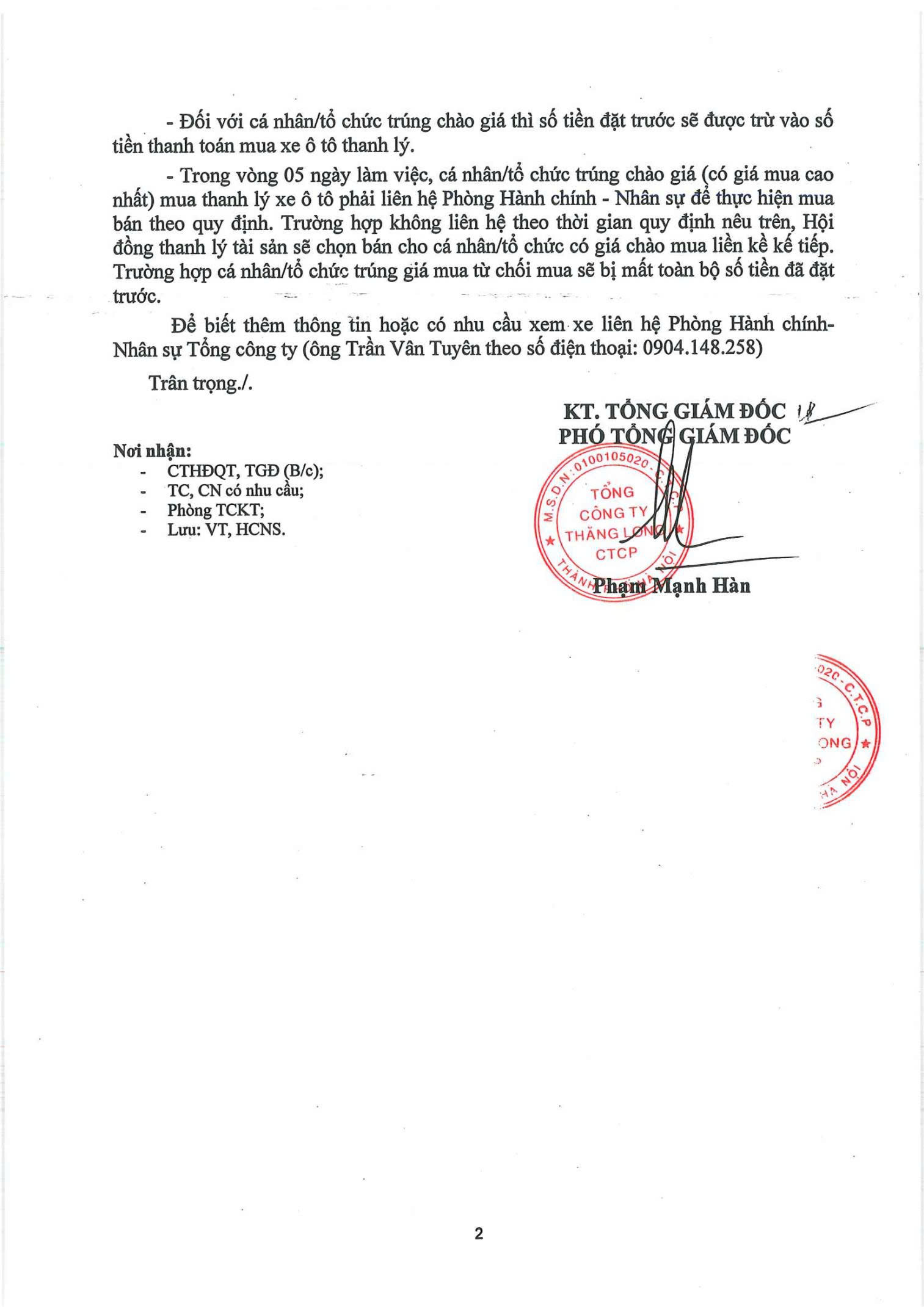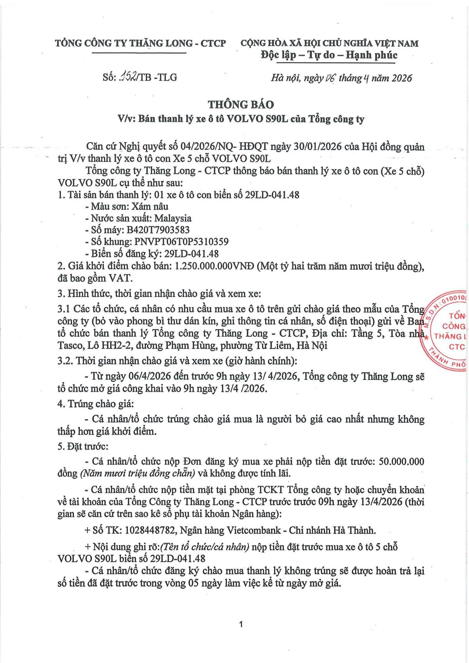 Tổng công ty Thăng Long -CTCP thông báo bán thanh lý xe ô tô VOLVO S90L của Tổng công ty